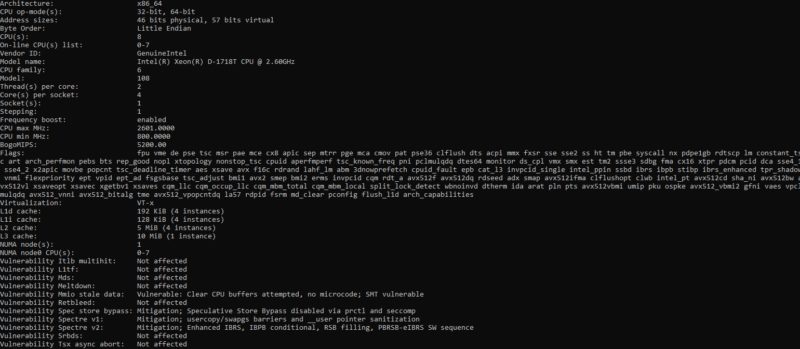 First, since many will not have seen it yet, here is the lscpu output for the Intel Xeon D-1718T. This is an Ice Lake-D chip so its capabilities will closely match other Ice Lake parts like the 3rd Generation Intel Xeon processor line, codenamed “Ice Lake”. That is by design. Intel wants to ensure that it has parity between data center and edge platforms.