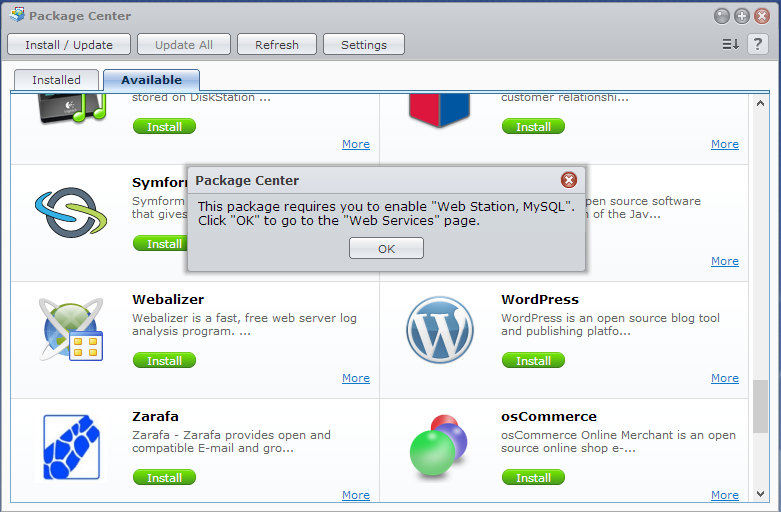 Synology DSM Package Center Install Wordpress Enable Web Station and MySQL