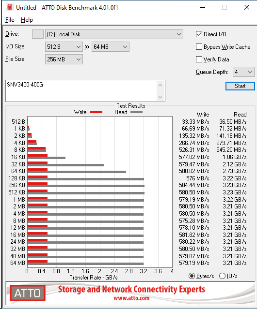 In ATTO, the SNV3400-400G continues to outperform its own rated specs, and turns in very consistent results across the entire benchmark.
