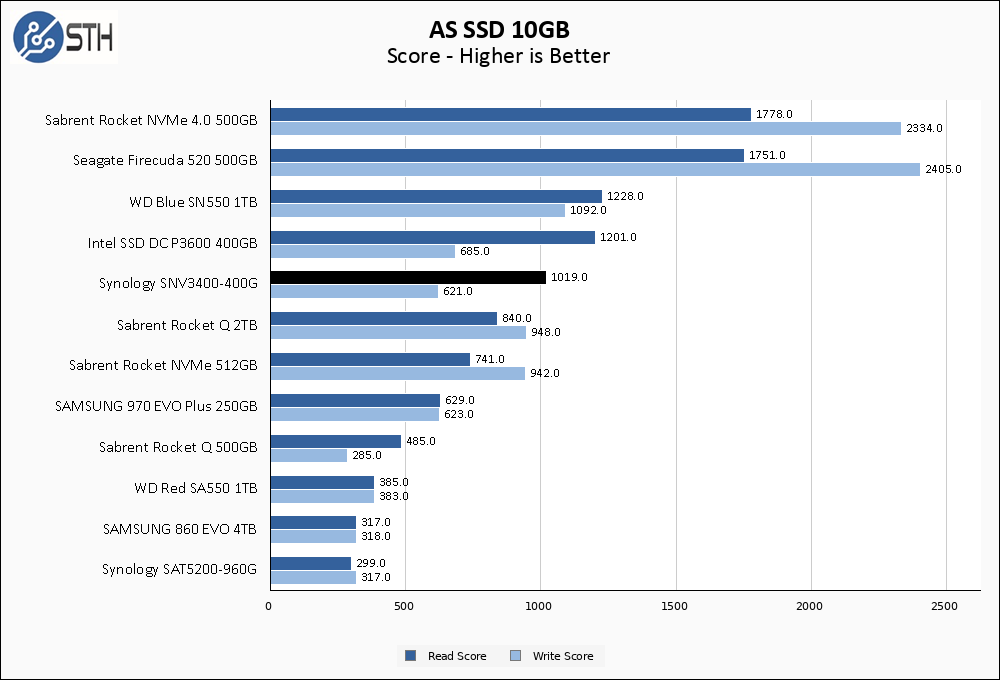 AS SSD presents another opportunity for the SNV3400-400G to shine, at least compared to any of the SATA drives on the list. Compared to other NVMe SSDs it is still trending low on the chart.