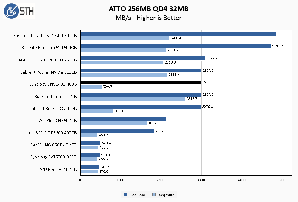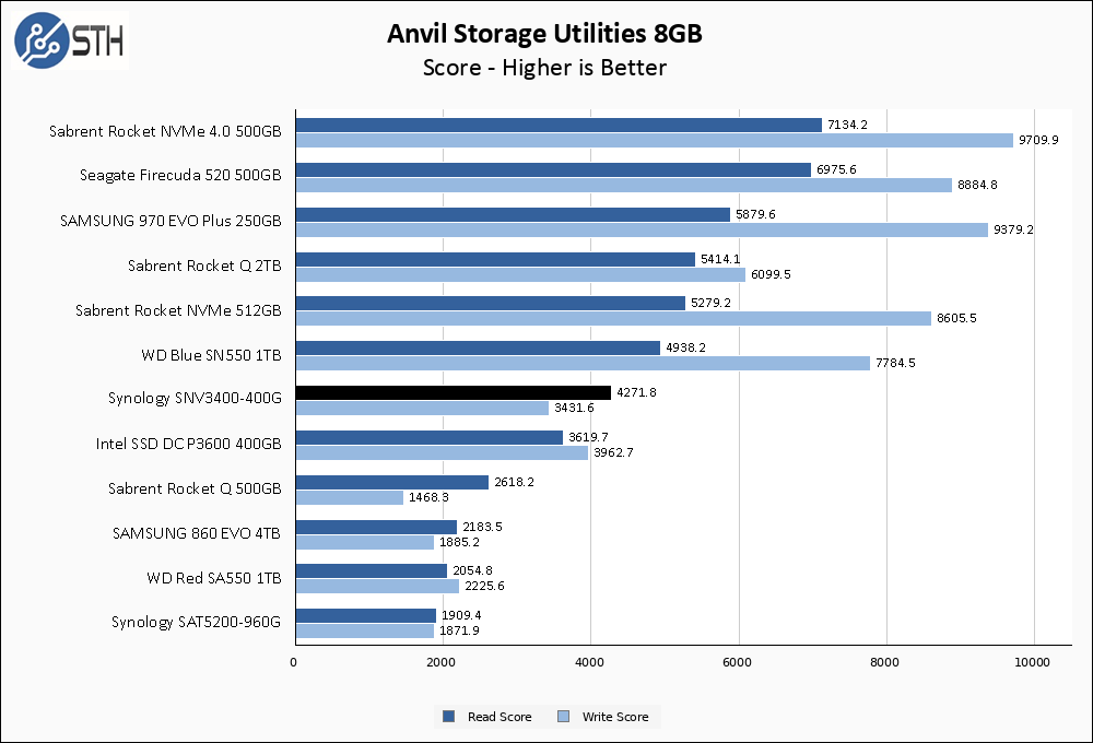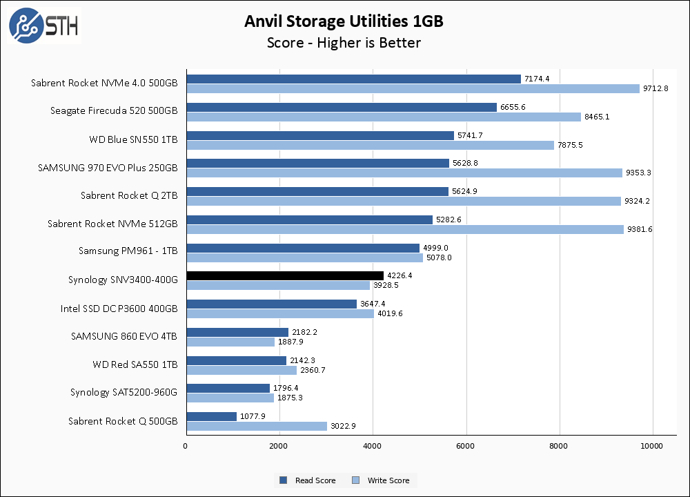 With Anvil we start to see some separation in the write performance achievable on the SNV3400-400G compared to SATA drives. In previous benchmarks they were fairly close, but in Anvil the NVMe drive runs away with the show. Of particular note are the very strong random 4K, 4KQD4, and 4KQD16 results that easily smash the SATA based Synology SAT5200-960G and the WD Red SA550 1TB drives.