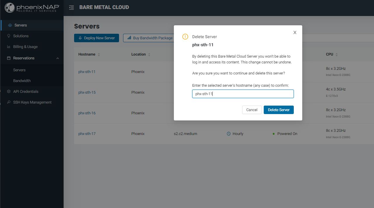 PhoenixNAP BMC Delete Server Confirmation