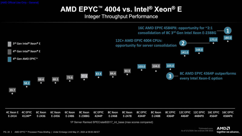 Since there are many SKUs that we do not have, here is AMD’s SPECrate2017_int_base for the CPUs that AMD is using.