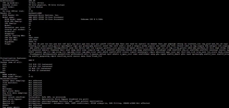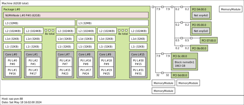 Just since folks like to see this, here is what the topology looks like. We can see both 32MB L3 clusters one fore each 8-core compute die.