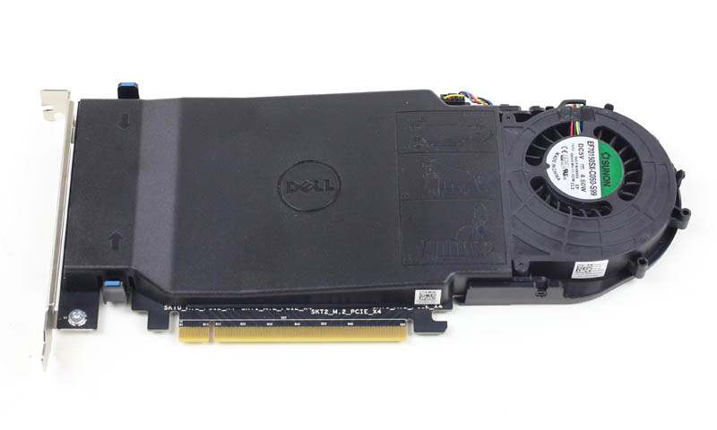 One can see the 4-pin fan and a giant shroud. On the back of the card we can see the fan bolted to a PCB assembly with multiple through holes for the different m.2 mounting sizes. We can also clearly see a PCIe x16 connector.