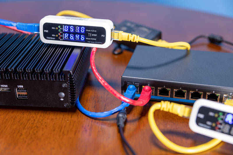 Everything was not perfect, however. Here is a fun shot of a setup that caused an issue. Here we have the blue cable on Port 1 going into the power meter. That is then feeding into the PoE splitter and is powering both the fanless Intel N6005 system as well as providing 2.5GbE data access to the device. The red cable is powering a Netgear WAX630 on Port 2, and then there is a power meter in target mode on Port 7.