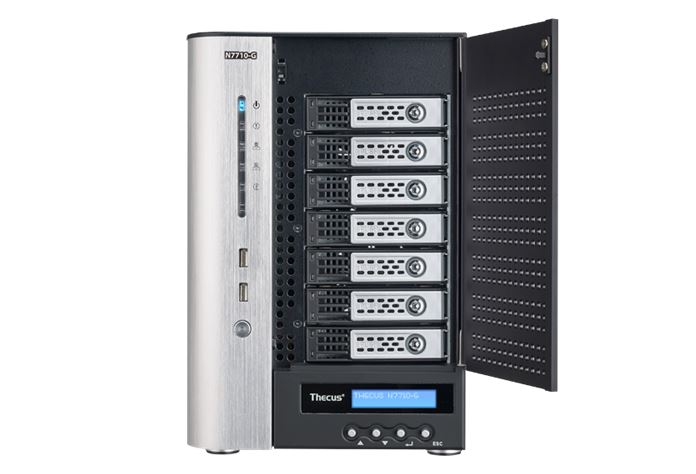 Recently we had the opportunity to test the Thecus N7710-G. This is a follow-up piece to our Thecus N7510 review and ThecusOS web management pieces. After some time we were able to put the Thecus N7710 through our benchmark suite. Like the N7510 the N7710-G is a 7-bay NAS unit. There are a few other similarities including dual gigabit Ethernet connections and HDMI out capabilities. The N7710-G is a much more robust unit. It features an Intel Pentium G850 processor, 4GB ECC DDR3 RAM and a 10 gigabit Ethernet connection. Whereas the N7510 was largely constrained by its limited network connectivity, the N7710-G has faster networking and a 2.9GHz dual core processor to power it.