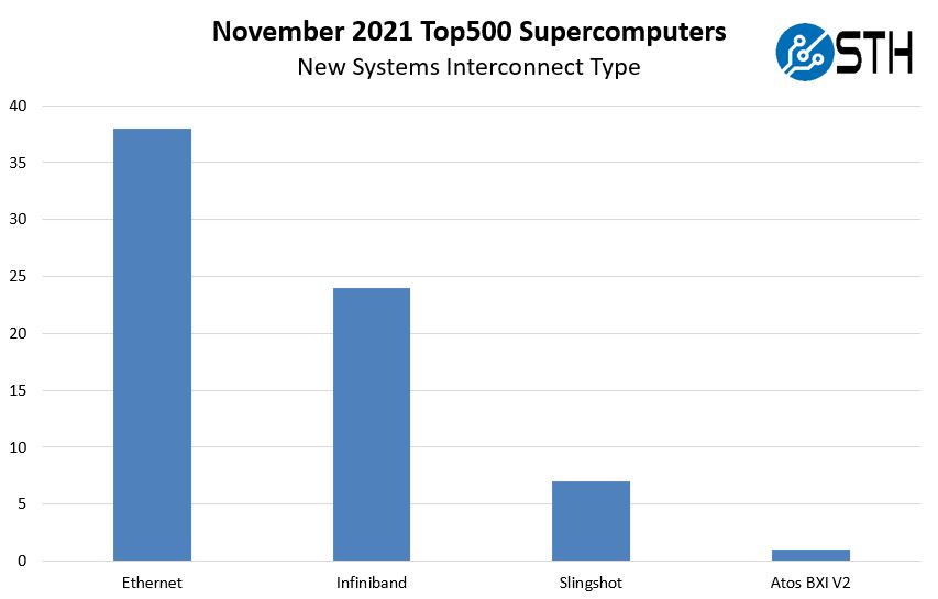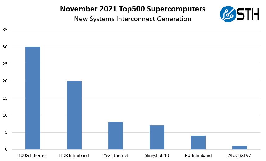 As a quick note, there were four Russian systems that simply were marked with “Infiniband” so we are calling these RU Infiniband. Our best guess would be HDR but we just wanted to busket these separately in the event that assumption is incorrect. Also, on the Atos BXI V2, it is certainly well behind the HPE-Cray Slingshot in terms of adoption.