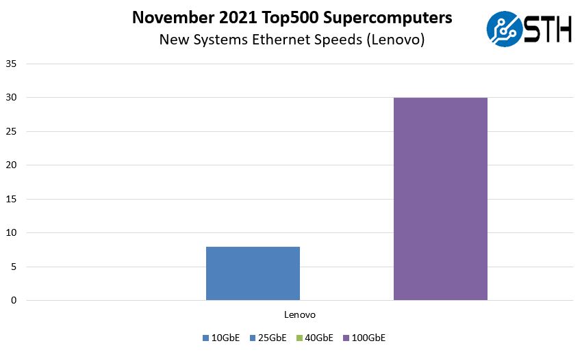 Lenovo tends to be the top Ethernet user for new systems on the list. This is no different except for two factors. First, no other vendor is using Ethernet. Second, we finally have a list with no 10GbE/ 40GbE. There are still 38 Ethernet systems but only 8 are 25GbE.