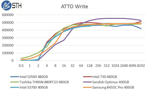 On the write side, we can see that the Toshiba THNSNJ480PCS3 excels at very small transfer size writes on the ATTO benchmarks. As the benchmark transitions to larger writes, it shows fairly average performance.