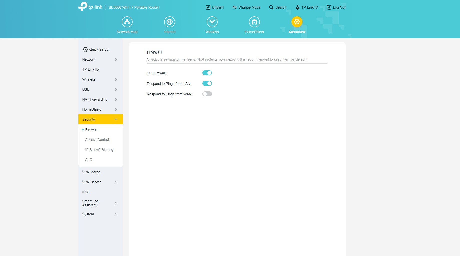 TP Link BE3600 Wi Fi 7 Portable Router Firewall Default