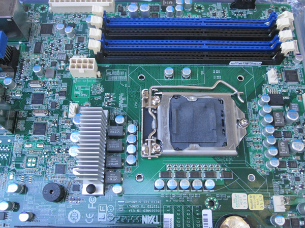 Expansion slots include one PCI, two PCIe x1 one PCIe x8 and one PCIe x16 physical (x8 electrical) slot. A nice feature is that the PCIe x8 slot has a cutout in the rear so it can be used with longer x16 physical cards. Tyan has kept the board clear from interference from this type of use which makes the slot very versatile. There is a clear pin-out on the Tyan S5512WGM2NR for a second PCIe x8 slot which is absent on this model. On other boards without the LSI SAS2008 controller onboard Tyan includes a second x8 physical slot.