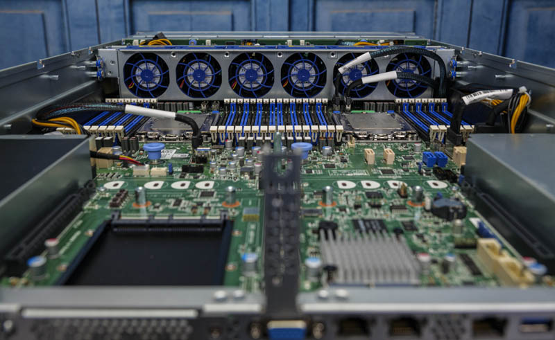 Those fans immediately cool the CPUs and memory. There are two AMD SP3 sockets designed for EPYC 7002 processors. In theory, this server should also be able to support EPYC 7003 processors codenamed “Milan” when they are launched later this year and available after that. Each CPU socket gets a full set of 8 channel memory with 2 DIMMs per channel (2DPC.) As a result, we get a total of 16 DIMMs per socket and 32 DIMMs total. This gives a maximum of 8TB of memory which is the maximum for the AMD platform.