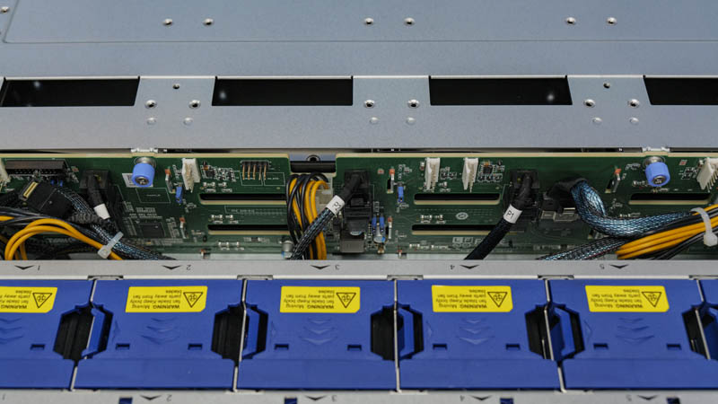 Behind the drive bays, we see the hard drive backplane. This backplane is held in by thumbscrews which makes it very easy to service. This is the piece that provides the flexibility to use both SATA/SAS and NVMe in the front bays.