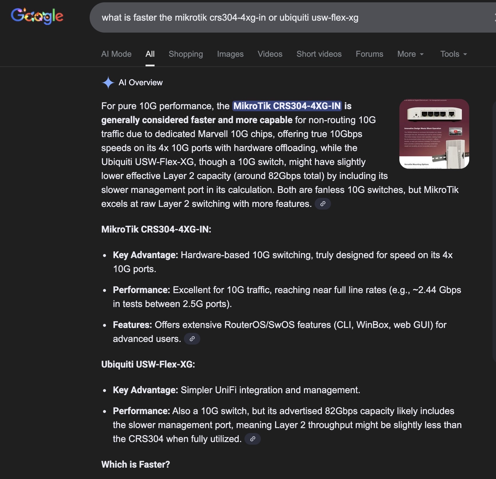 Google AI Search Result Which Is Faster MikroTik CRS304 4XG IN Or Ubiquiti USW Flex XG 2025 12 14