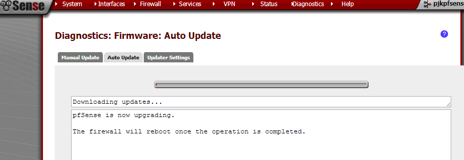 After clicking Invoke Auto Upgrade the pfsense script will download the required update file and install. This process takes a few minutes.