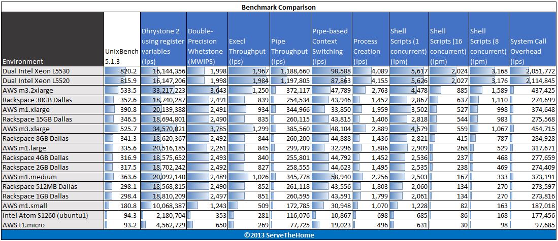 Dual Intel Xeon L5520 v L5530 Cloud UnixBench single threaded benchmark