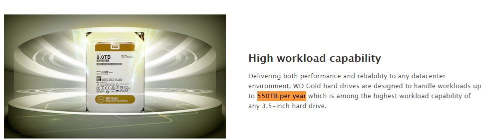 Highest workload capability – Delivering both performance and reliability to any data center environment, WD Gold hard drives are designed to handle up to 550TB per year which is the highest workload capability of any 3.5-inch hard drive.
