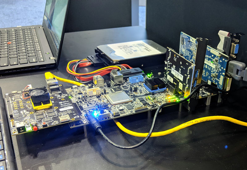 Connected to $3000 of development boards and a few PCIe cards, is a 14TB Western Digital hard drive. Ten to fifteen years ago, an 8GB ECC memory NAS with 14TB attached would have been considered a fairly good size solution. Now, it is a show floor prototype.