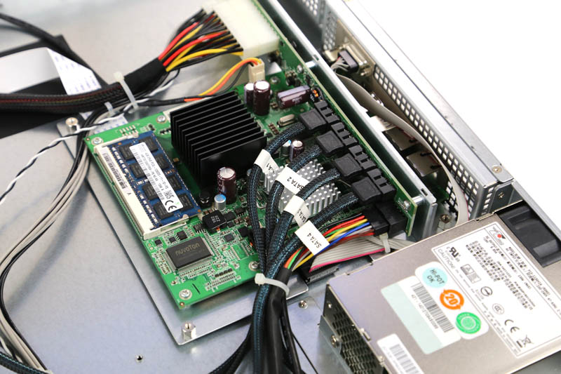 Taking a closer look at the motherboard one can see a very interesting setup. There is the Atom D525 along with a 4GB SK.Hynix SODIMM. Power and SATA ports are mounted on a piece of PCB perpendicular to the motherboard. This is a lower power configuration and fine for this 4-bay NAS.