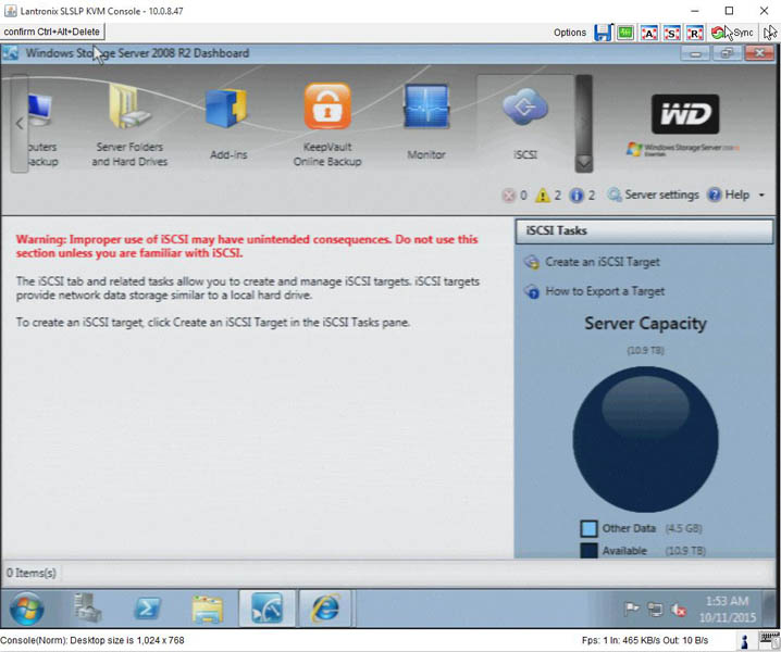 Setting up the Western Digital Sentinel RX4100 16TB NAS is either extremely easy or extremely difficult. We first installed the unit and tried using the host name and web browser. Due to the network security settings we have in the lab, the host name did not resolve and Windows Storage Server 2008 R2’s IIS implementation does not allow one to use the IP address. We were able to return to the datacenter later that day and hook up a Lantronix Spider KVM unit. The other option would be to hook up a local keyboard, video and mouse. Frankly, not having a reliable way to setup a rackmount NAS remotely is not ideal. Luckily, we have access to a Lantronix unit and most datacenters have one on hand.