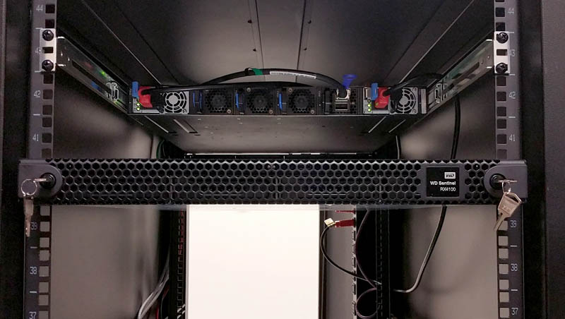This is a fabulous feature because SMB servers do suffer from theft quite often when racked in a local office. The system requires the faceplate is unlocked from both sides and WD provides sets of keys for this. Just remember not to lose the keys! For those wondering, the unit mounted above this WD NAS is a Quanta T3048-LY9 (48-port 10Gbase-T + 6 port SFP+) switch that we use in the lab. That switch will make a cameo in our thermal imaging so we did want to make note of it here.