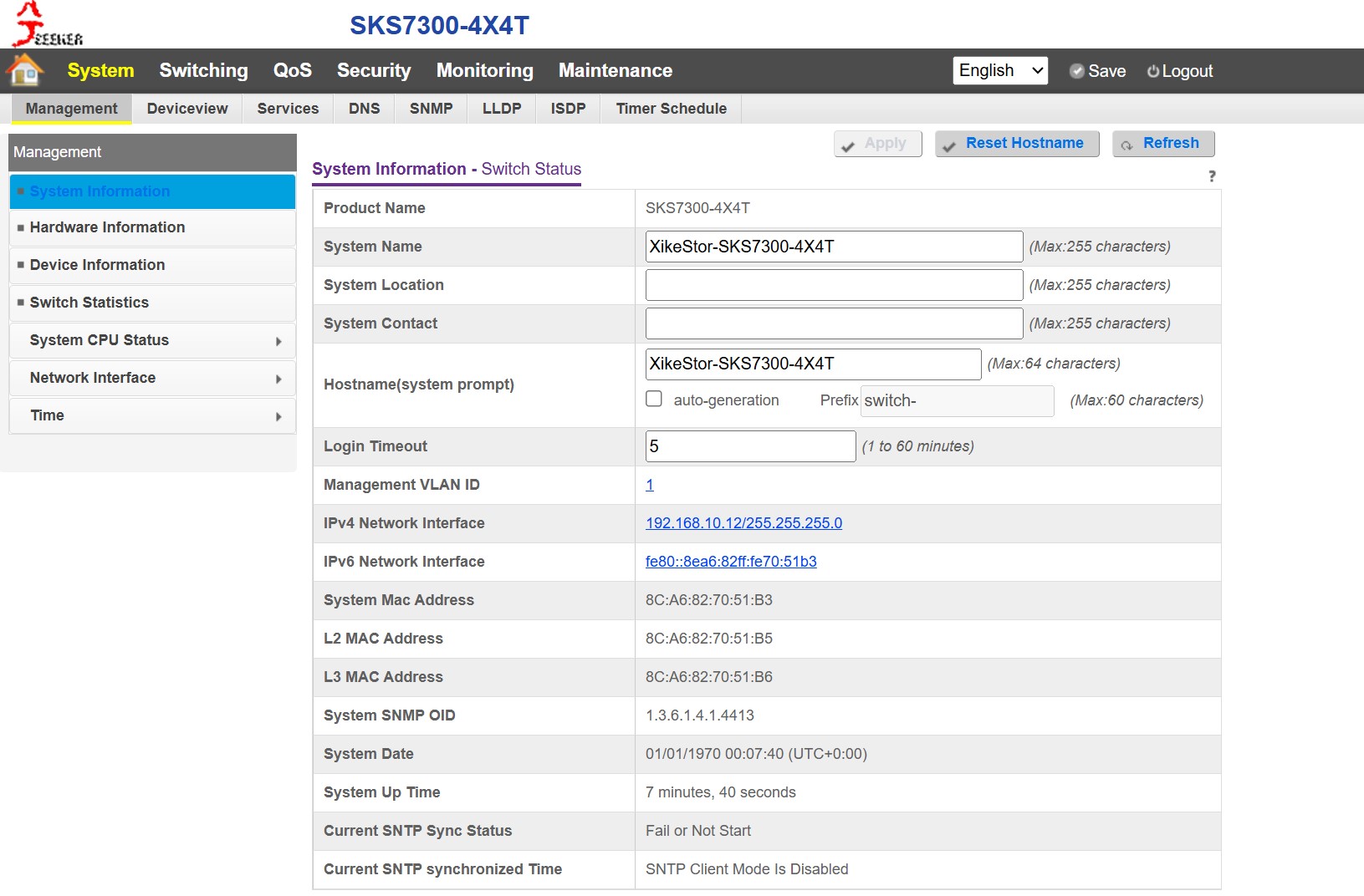 XikeStor SKS7300 4X4T Dashboard Management Page