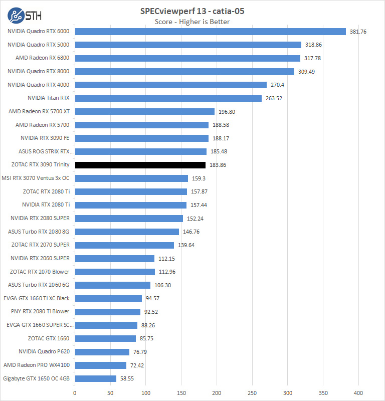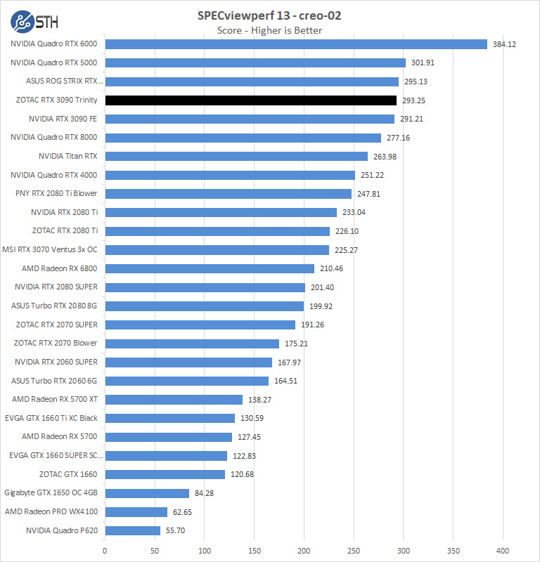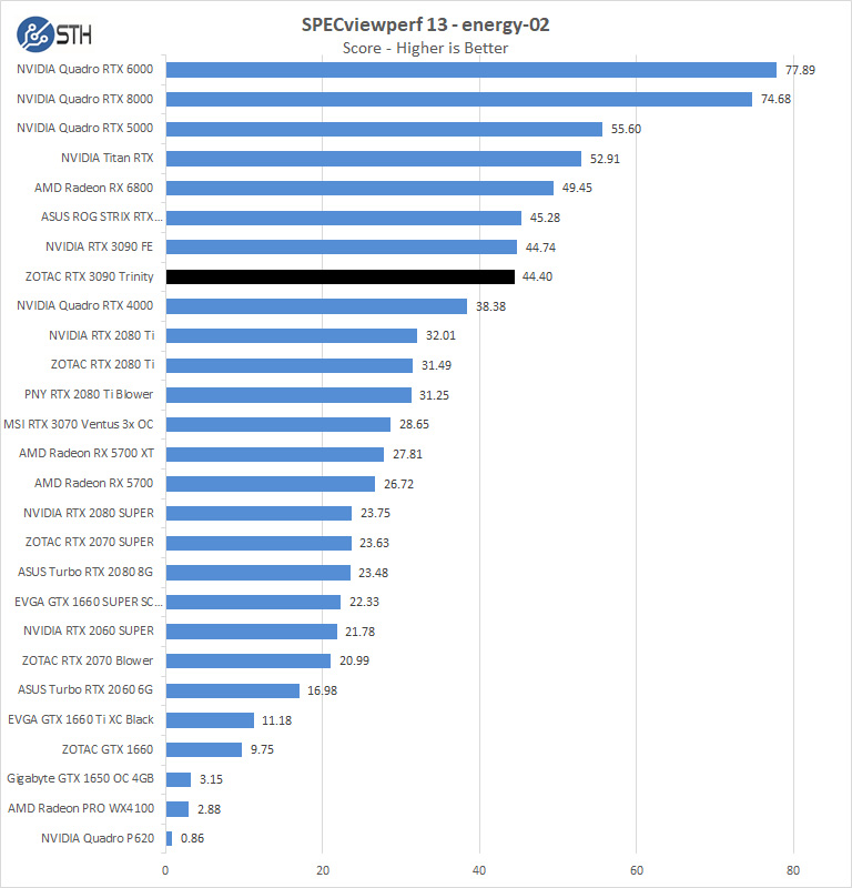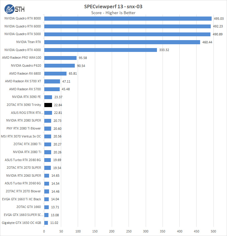 In the first chart for SPECviewperf, we find the ZOTAC RTX 3090 Trinity performance is generally good, NVIDIA is significantly ahead in most benchmarks here. It is also worthy to note that Quadro class GPUs are still the way to go in some cases.