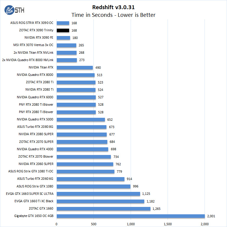 With a one-second difference, the ZOTAC RTX 3090 Trinity shows respectable scores with the 4th fastest render time. Here we see the impact of the higher-end RTX 3090 editions.
