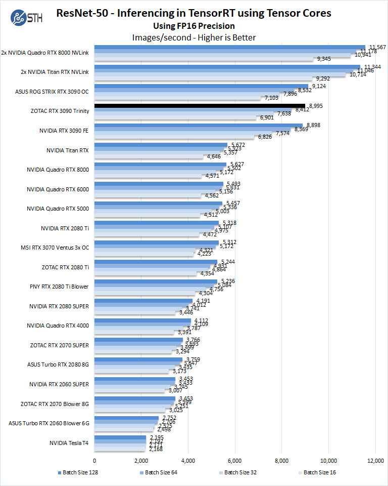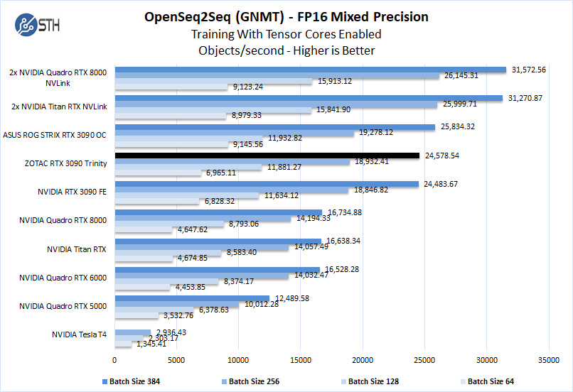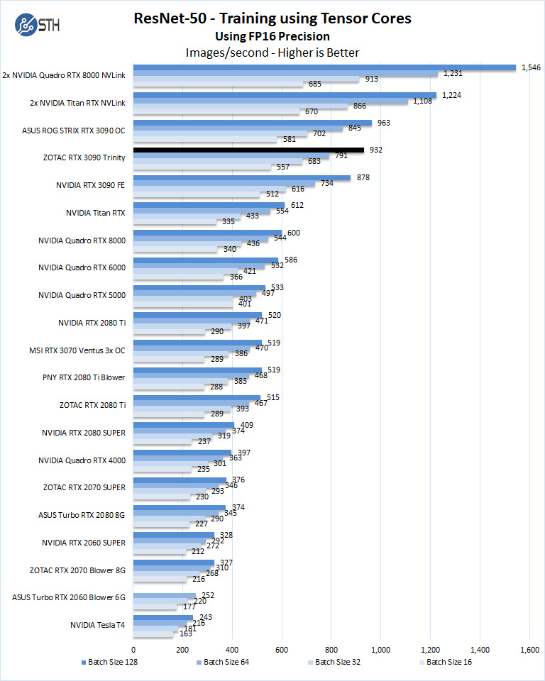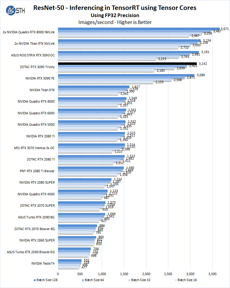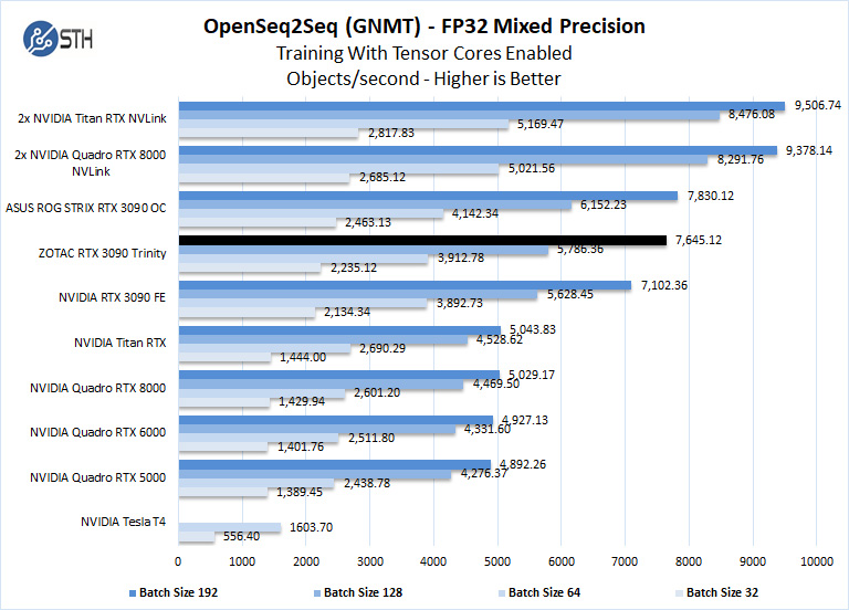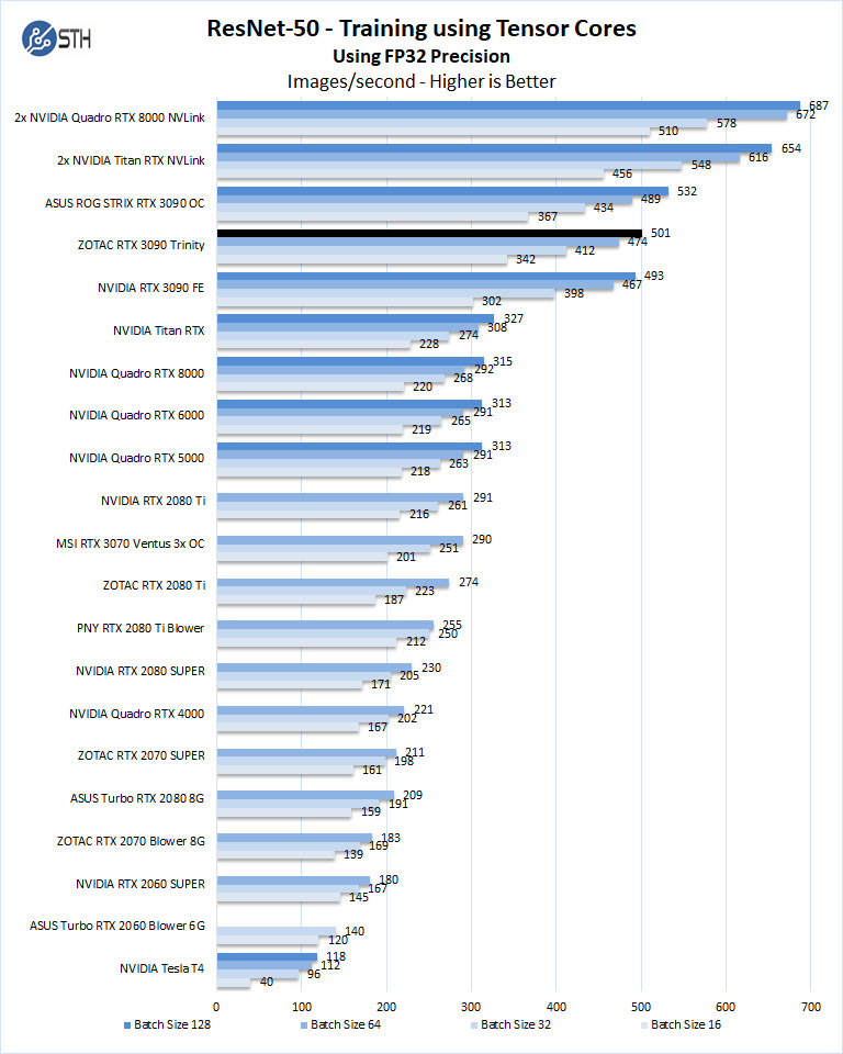 The ZOTAC RTX 3090 Trinity has 24GB of installed memory, equal to that of the Titan RTX. The Quadro RTX 8000 includes 48GB of installed memory, which can train larger models than what we have here while keeping within the card’s memory footprint. Still, we see the RTX 3090 GPUs are very powerful in deep learning workloads. Here the ZOTAC RTX 3090 Trinity compares well to the other RTX 3090 GPUs.